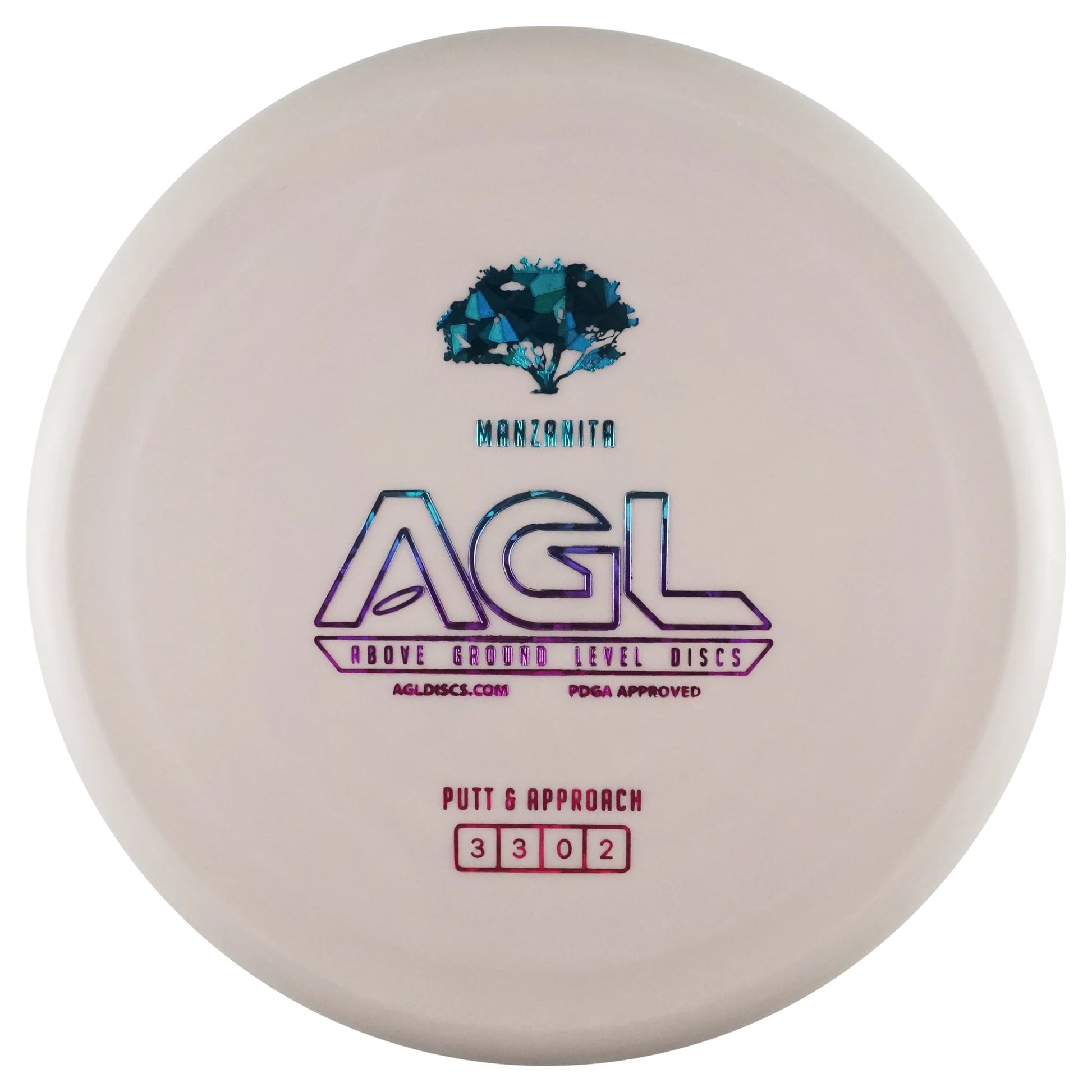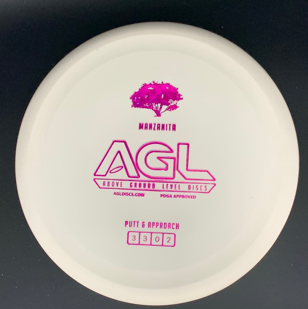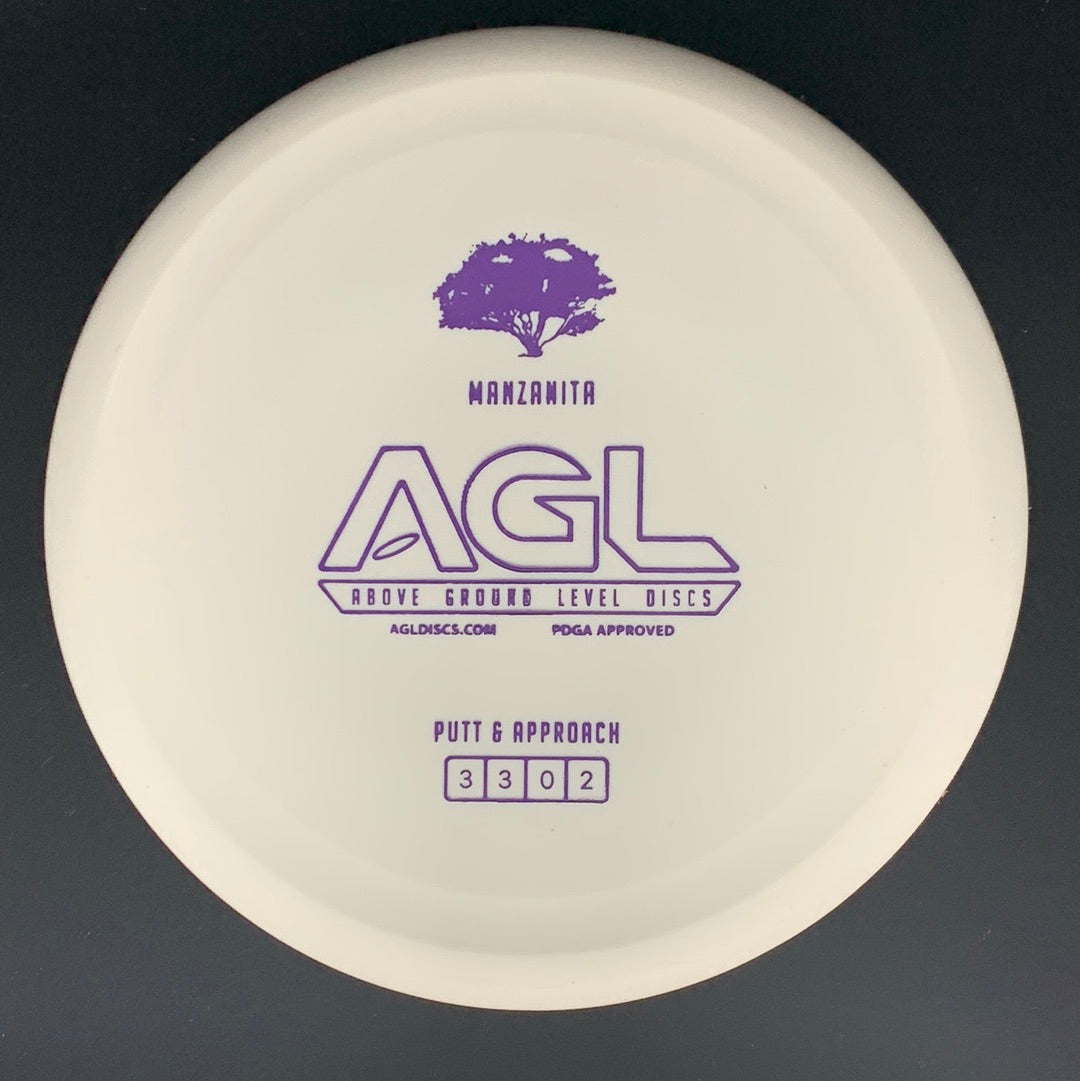 The AGL Discs Manzanita is a stable to slightly over-stable putt and approach disc golf disc with a beadless rim, featuring a shallow thumb track. The Manzanita is a go to disc for some head wind putts, for hitting those tight forehand approach shots, and for those back hand shots which require a predictable fade. Featuring flight numbers of 3/3/0/2 the Manzanita is very torque resistant, and we would say “the most stable of the AGL putters”. Need a long C2 putt? Maybe a long hyzer shot into a protected pin? Do you have a tricky long headwind putt? Just reach for the Manzanita and take your game Above Ground Level.
