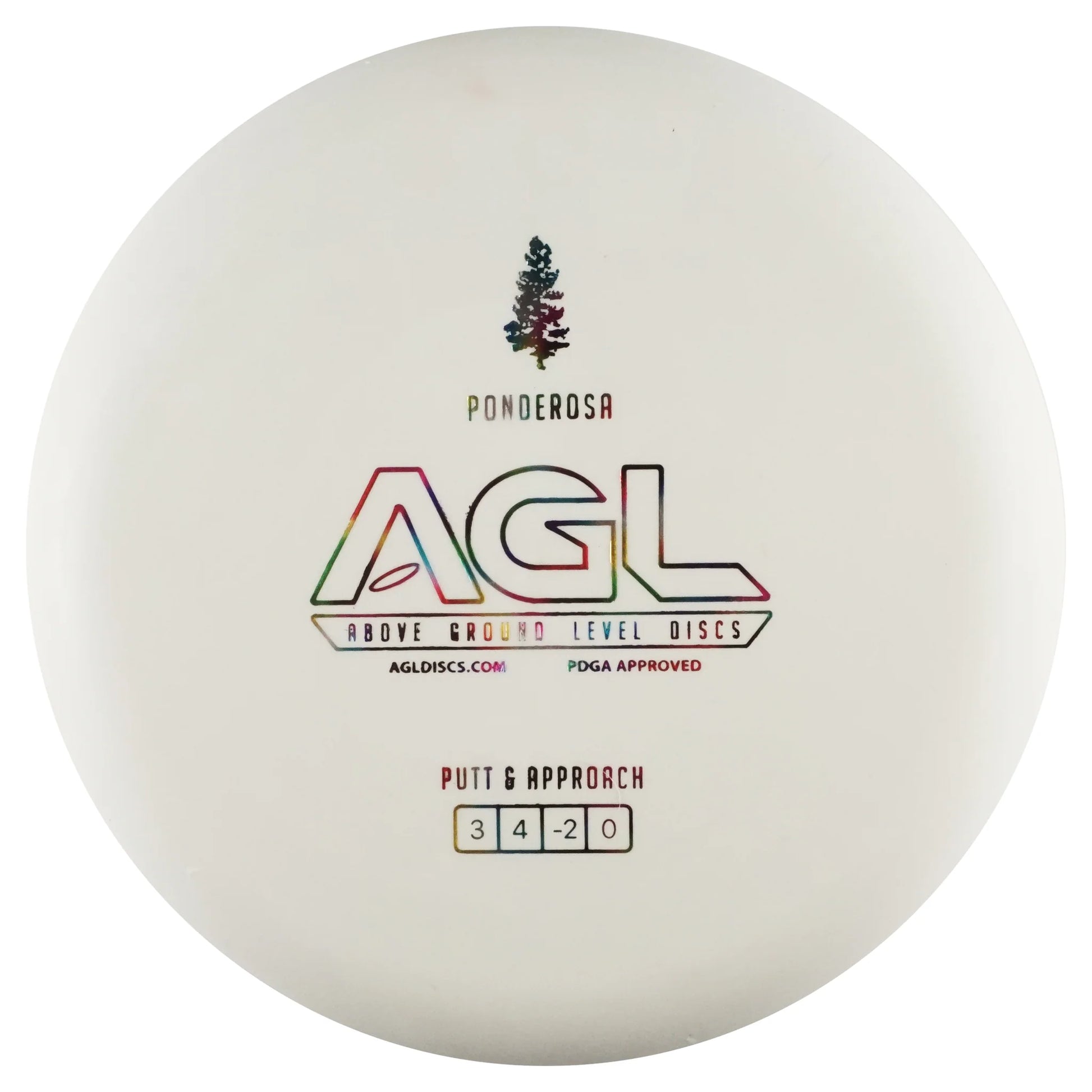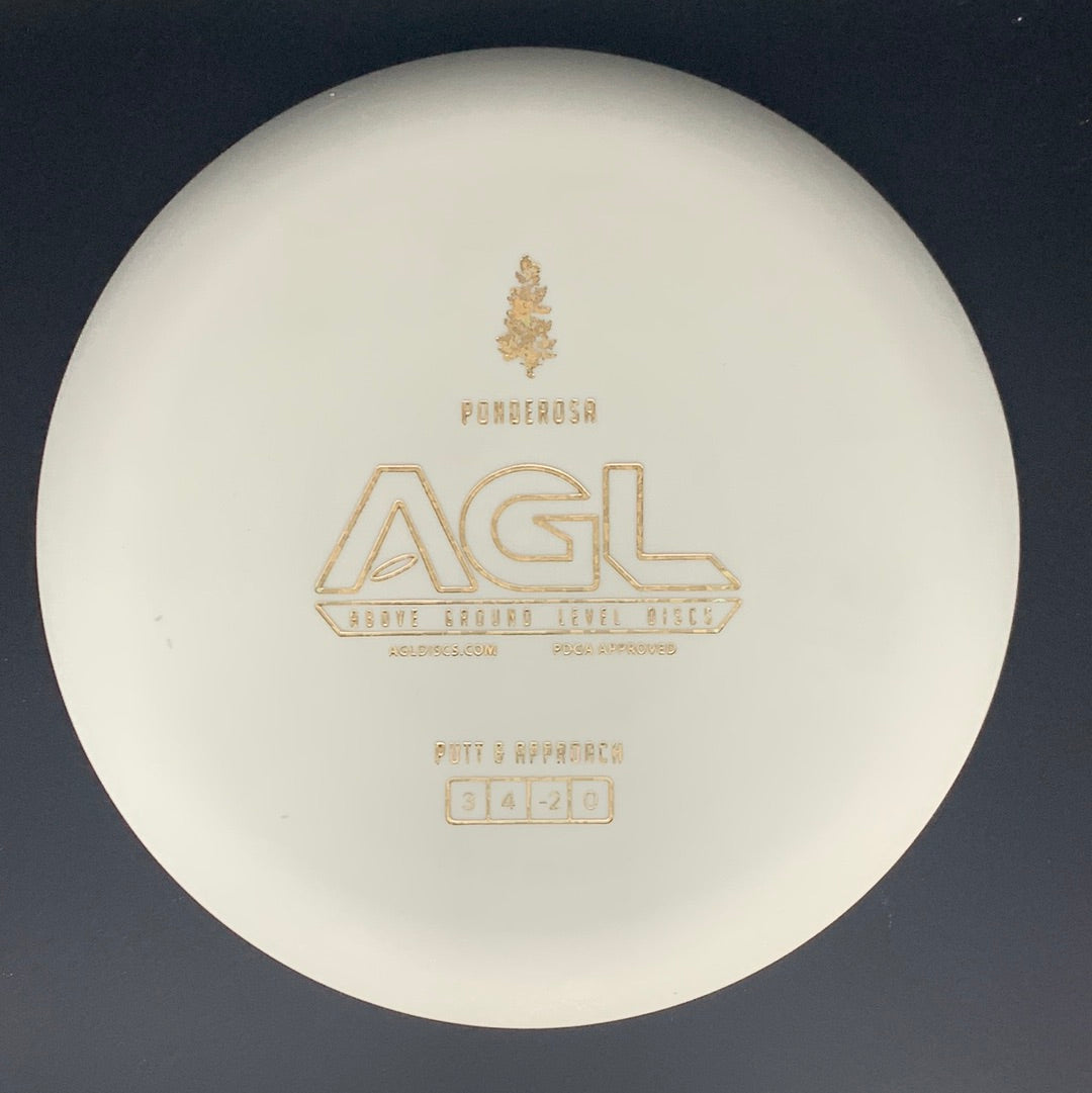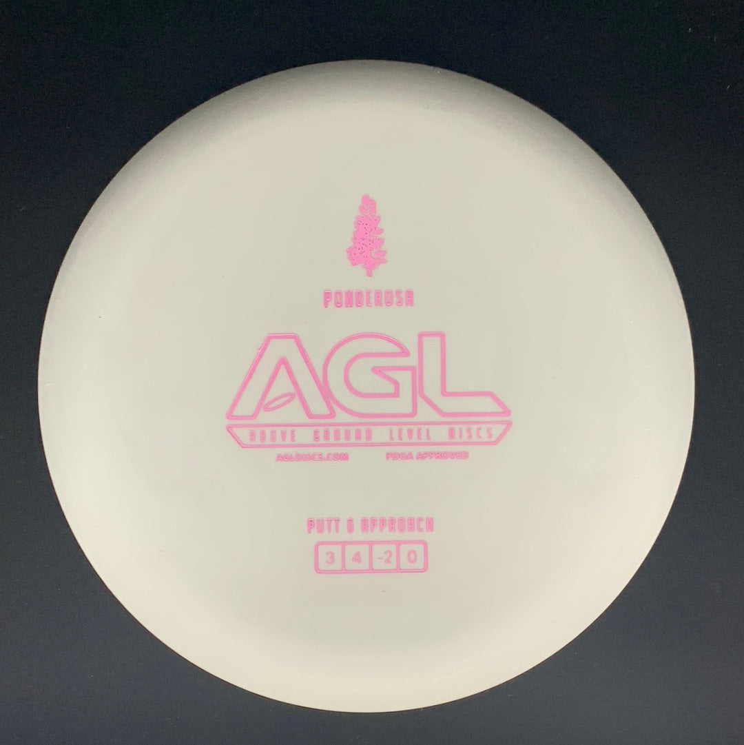 The GLOW AGL Discs Ponderosa is an understable GLIDEY putter of a disc golf disc. The Ponderosa is perfect for beginners and veterans alike, as it really does take a lot of the work out of putting. The flight numbers which ring in at 3/4/-2/0 mean that this disc pops up and flies straight and long for slower arms, and it provides long arcing turn over shots for those with a bit more power. The glide on this disc is CRAZY and means that the ponderosa is also a great circle 2 putter. The Ponderosa is the least stable of the AGL putters with the others in the lineup each adding an additional level of fade. Whether you are new to the game or looking to add a new dimension to your short game the Ponderosa will take your putts Above Ground Level.