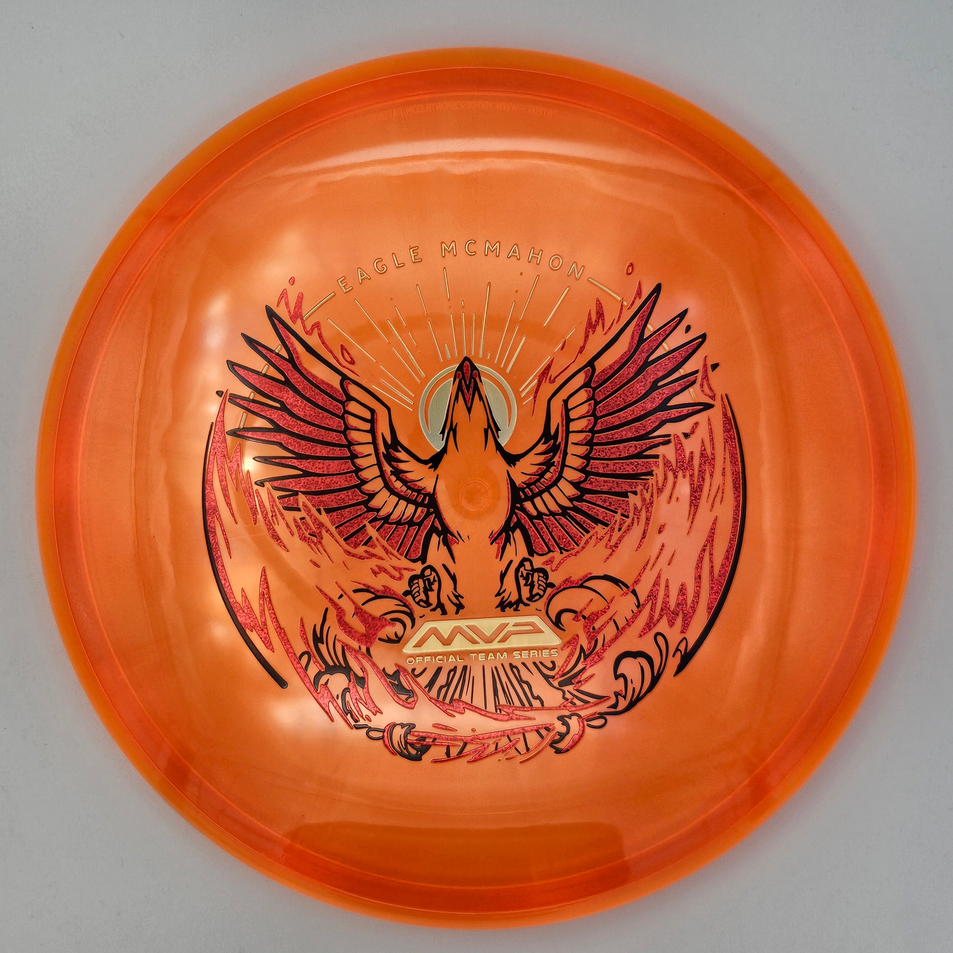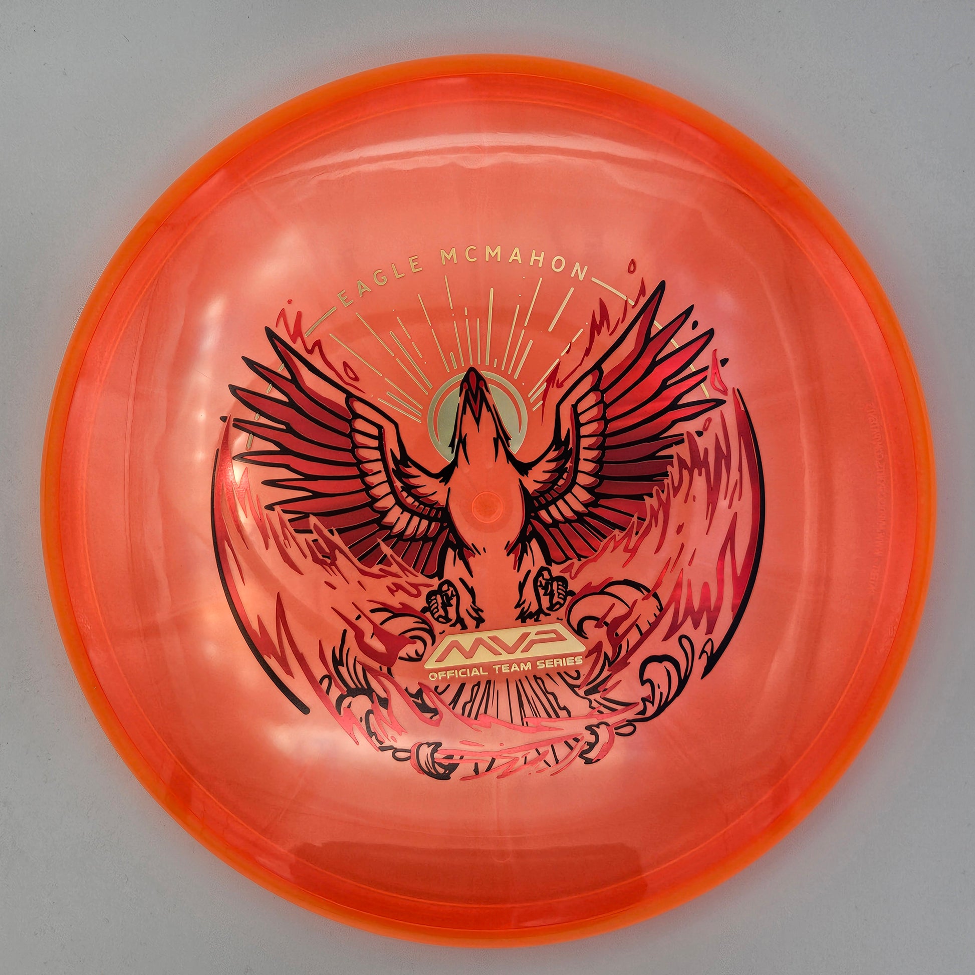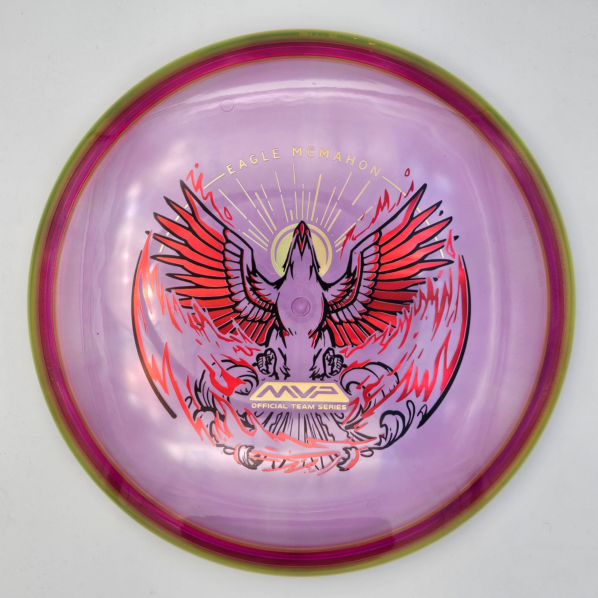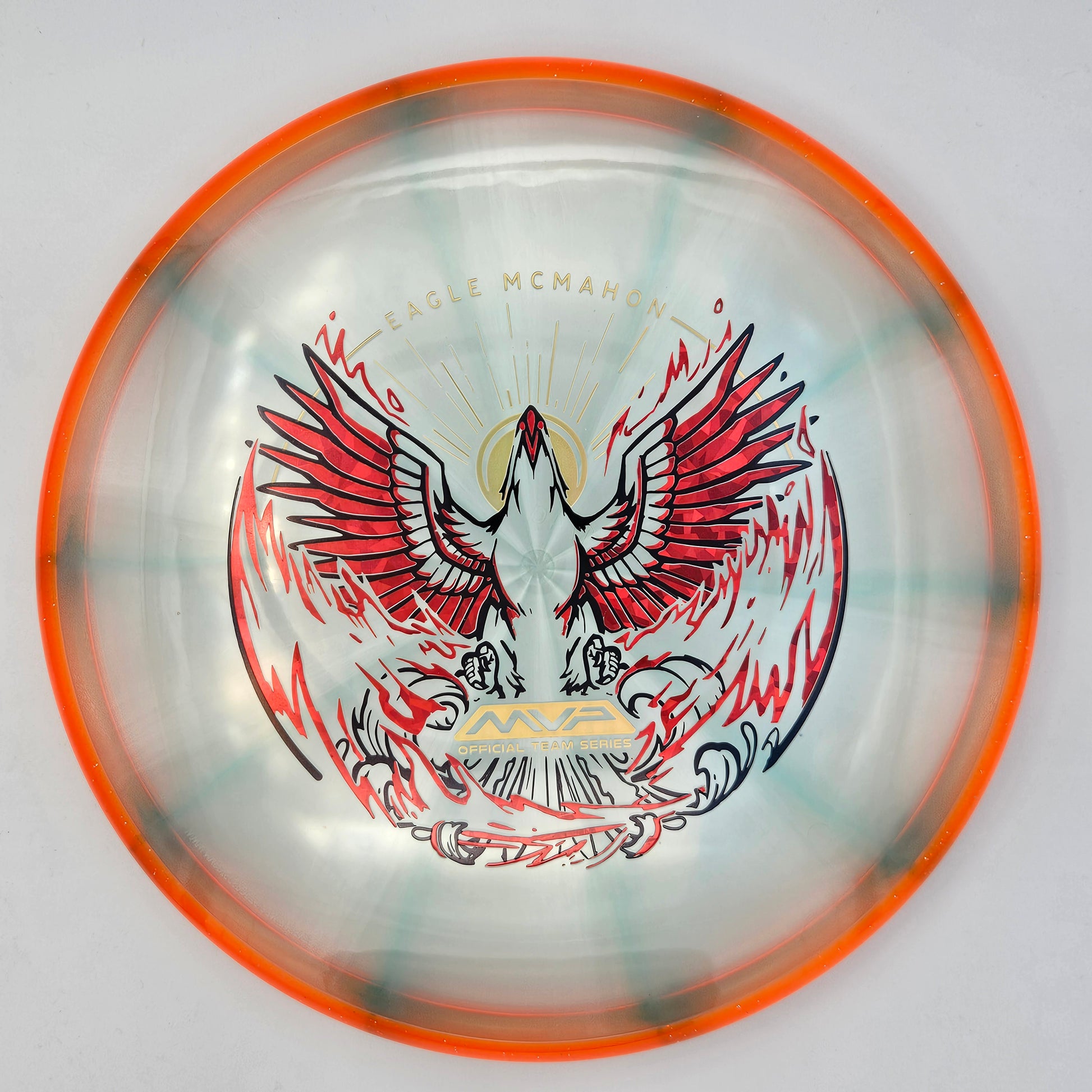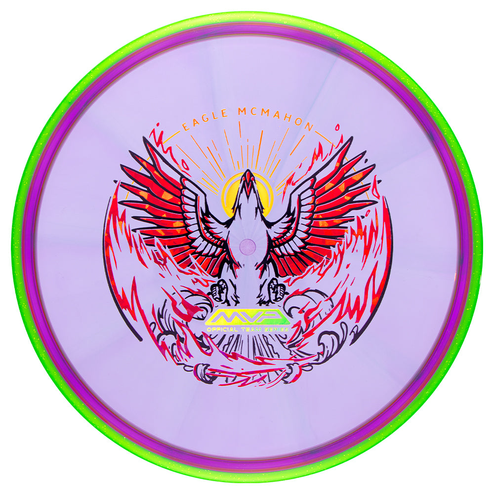 Like a phoenix rising from the ashes, Eagle McMahon’s first Official Team Series disc fully embraces the idea of new beginnings and the fire that burns within. Suitably named “Rebirth”, Mike Inscho has beautifully illustrated Eagle’s first triple-foil stamp, featuring an eagle rising from the ashes on his personal mold of choice, the Prism Proton Envy. Don’t miss your chance to snag the very first of what is sure to be a long line of discs that directly support Eagle!