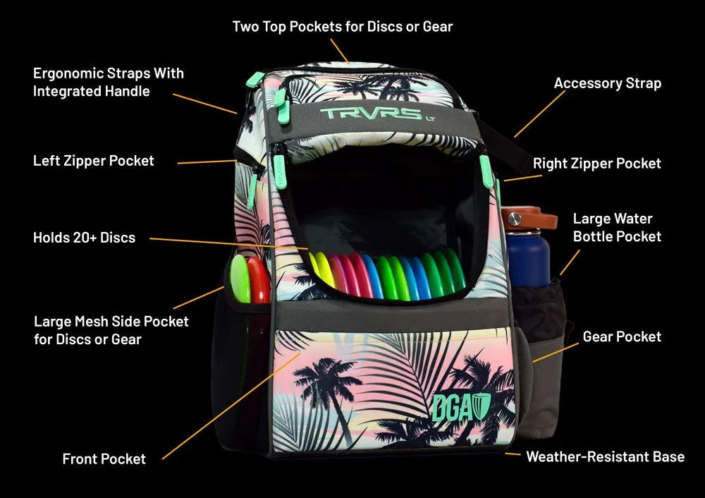 The TRVRS LT (Traverse Lite) is DGA’s new affordable backpack style Disc Golf Bag that is ready to take on any course! Boasting a 20+ disc capacity, this feature-packed bag has 8 different pockets & storage pouches for your discs and gear (in addition to the main disc compartment). Notable highlights include the large water bottle holder, accessory strap, and ergonomic shoulder straps with a convenient carrying handle.