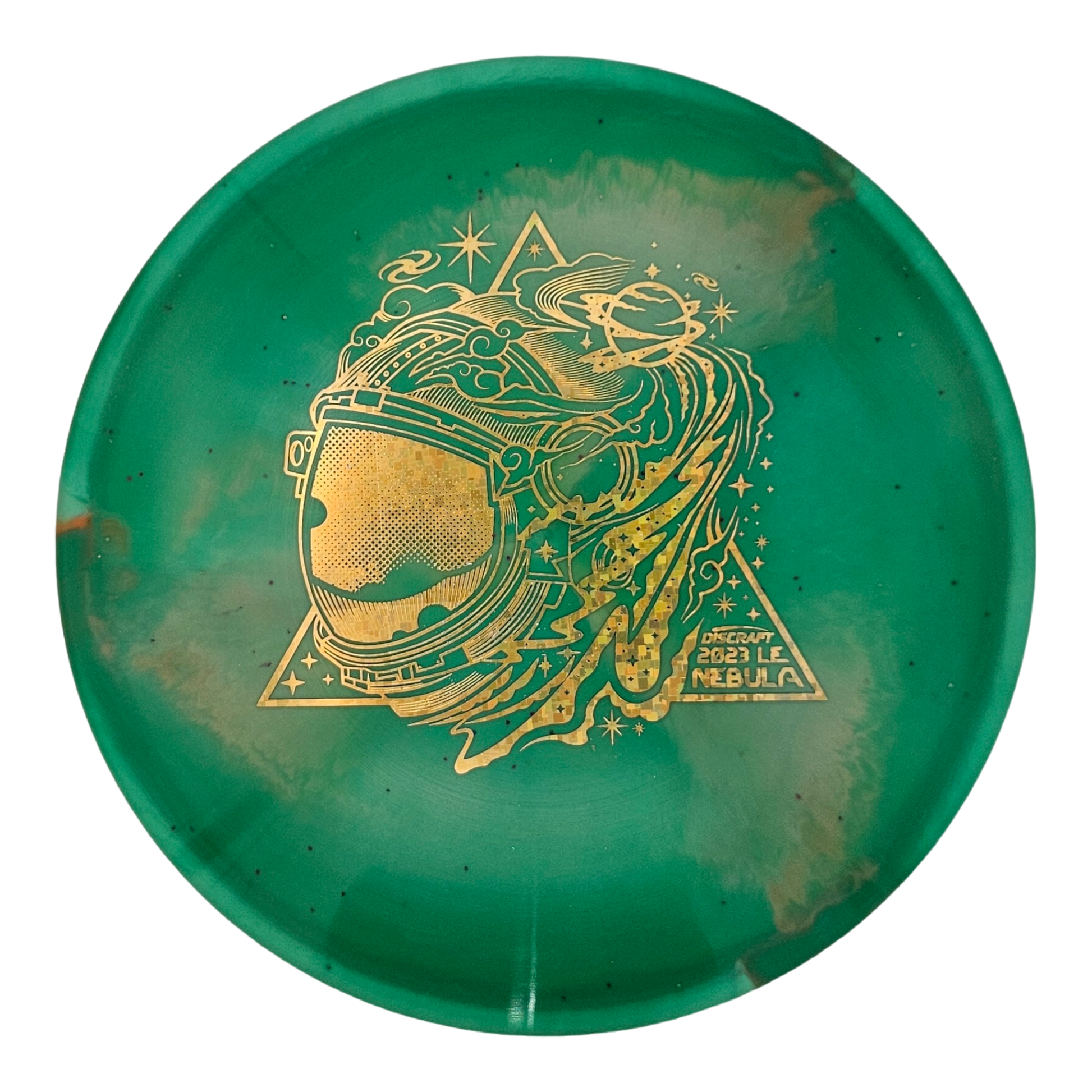 The Nebula was released in 2008 as Discraft’s Ace Race prototype and eventually became the predecessor to the Buzzz OS. Since then, the Nebula’s production has been discontinued at Discraft. That held true until the Ledgestone Edition Z Swirl Nebula was released as a limited run in 2021. The ESP plastic in this run increases grip and adds a tacky feel. These Nebulas all have vibrant swirls and a distinct shimmer with the metal flakes infused in the plastic. The stamp depicts the side profile of an astronaut helmet as the back end fades smoothly into a collection of galaxies, planets, and new stars in a nod to the disc mold’s name. This was part of a run of 1000 discs.
