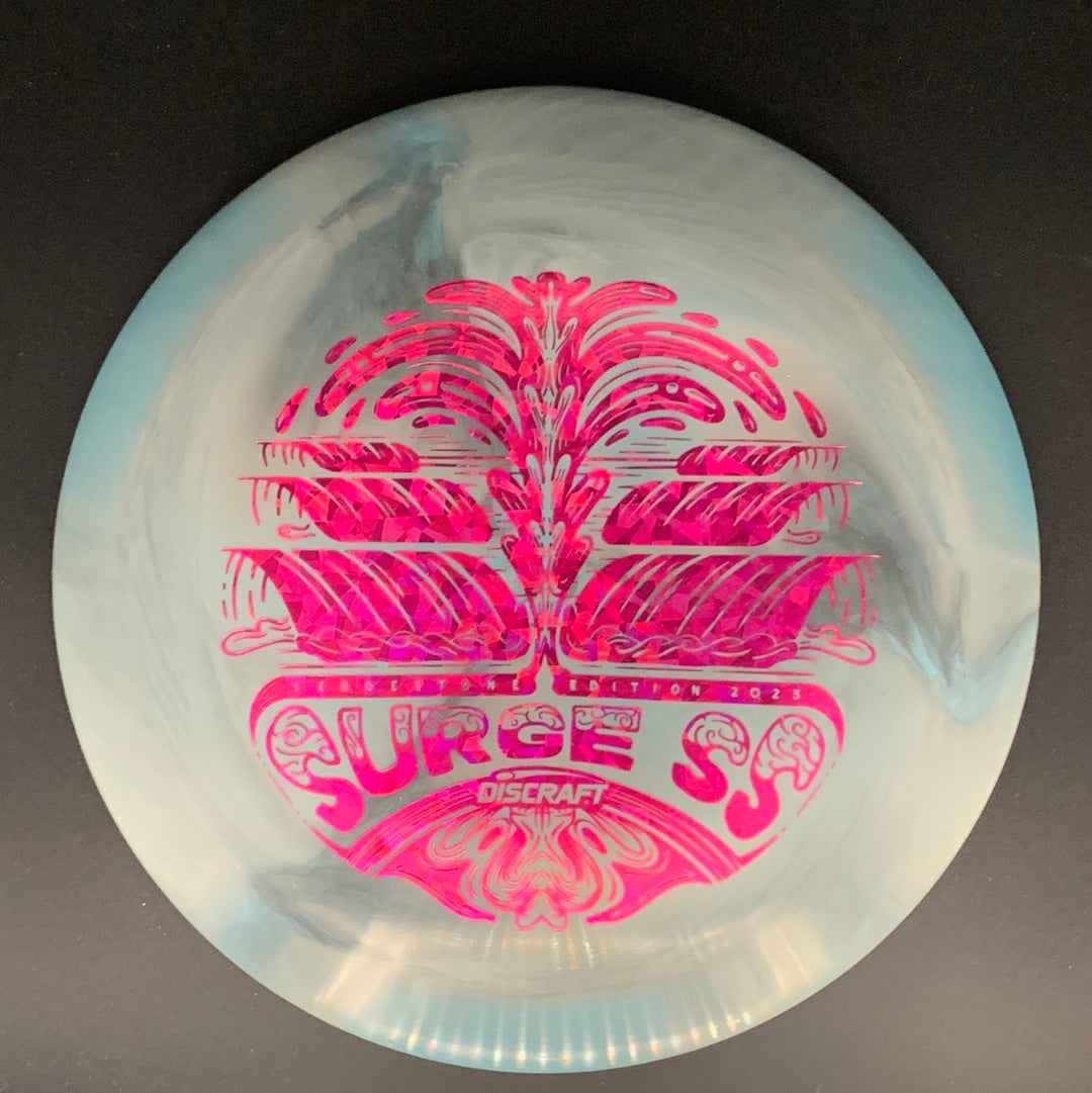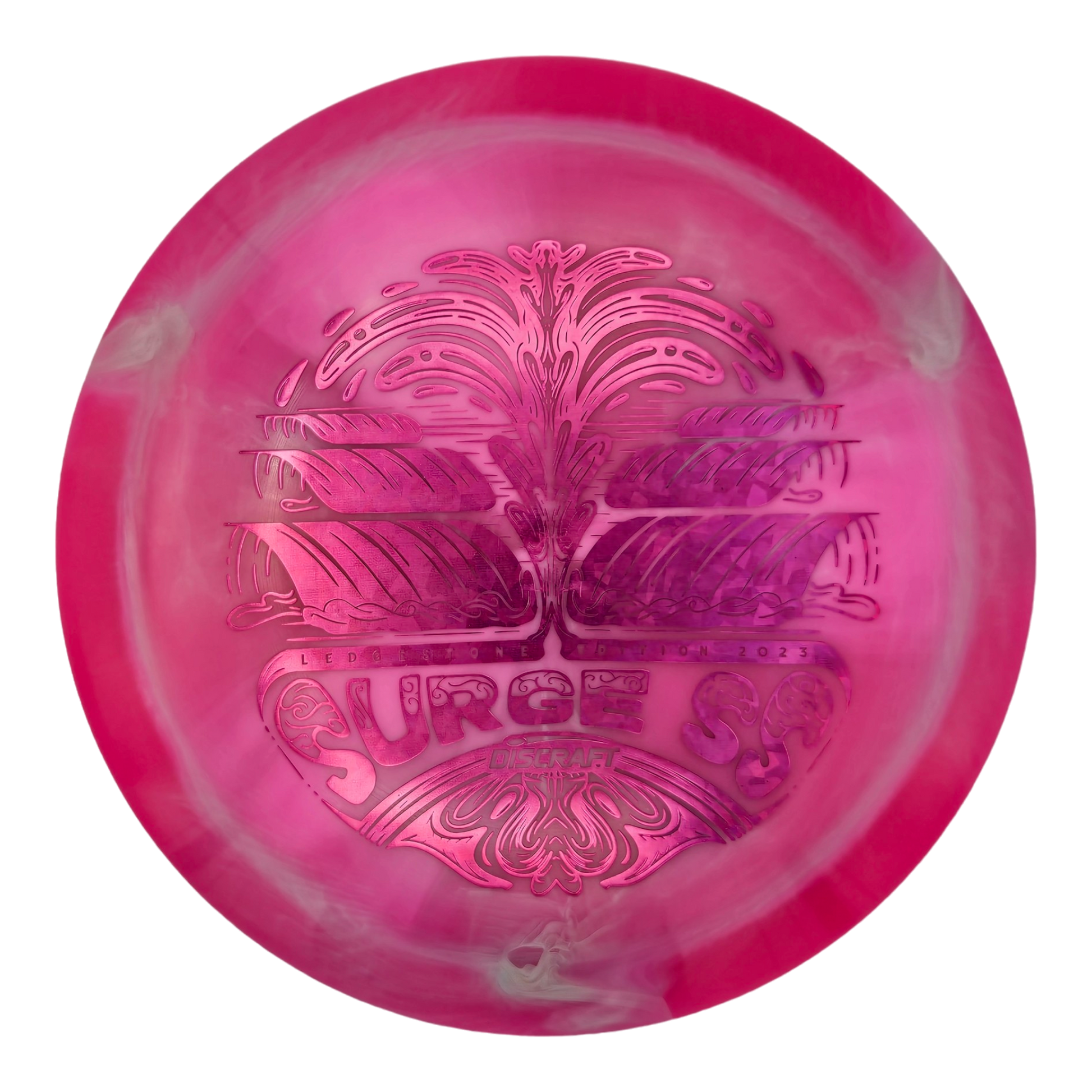The Surge SS is a less stable version of the Surge that has a straighter edge. The Surge SS offers more control and a straighter flight than the Surge, and works well for recreational and intermediate players. This run of the Surge SS was part of a limited run of only 1000 in Discraft's ESP Swirl plastic.