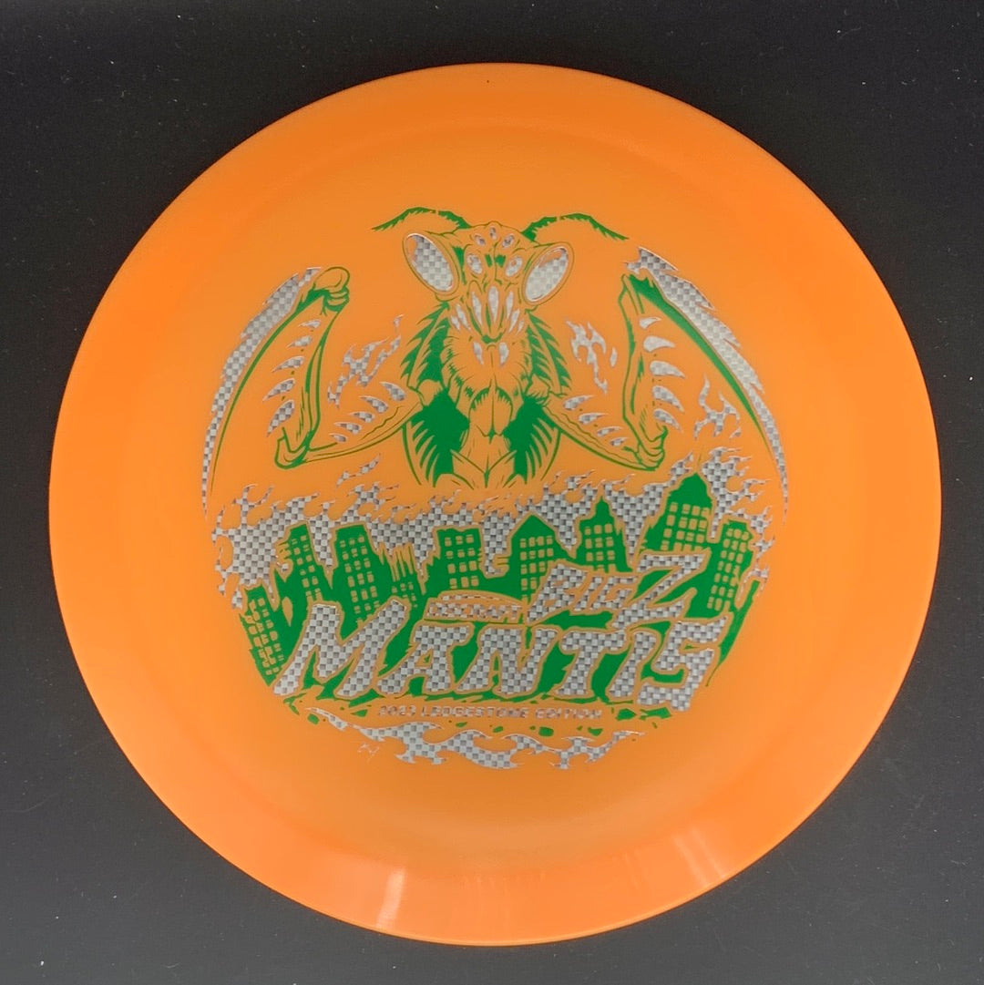 The Mantis stormed onto the scene in 2013 as Discraft’s Ace Race prototype disc. It quickly became a niche favorite for its controllable, understable flight. This fairway driver can be maneuvered through the woods on several different angles. In addition, its domey flight plate gives extended glide and is famous for adding extra distance with minimal effort. This run lacks nothing in glide and has a touch more high-speed turn in the Big Z plastic than standard Z plastic runs. The 2-color stamp makes the artwork pop as a large-scale Mantis towers over the city below. This was part of a run of 1500 discs.
