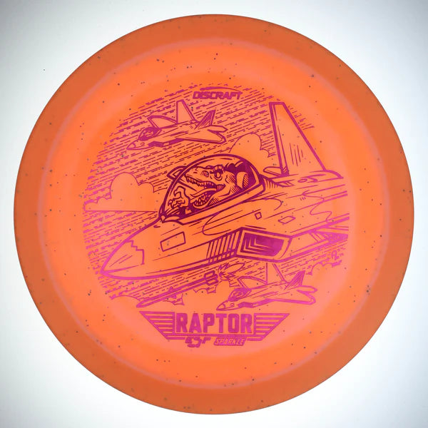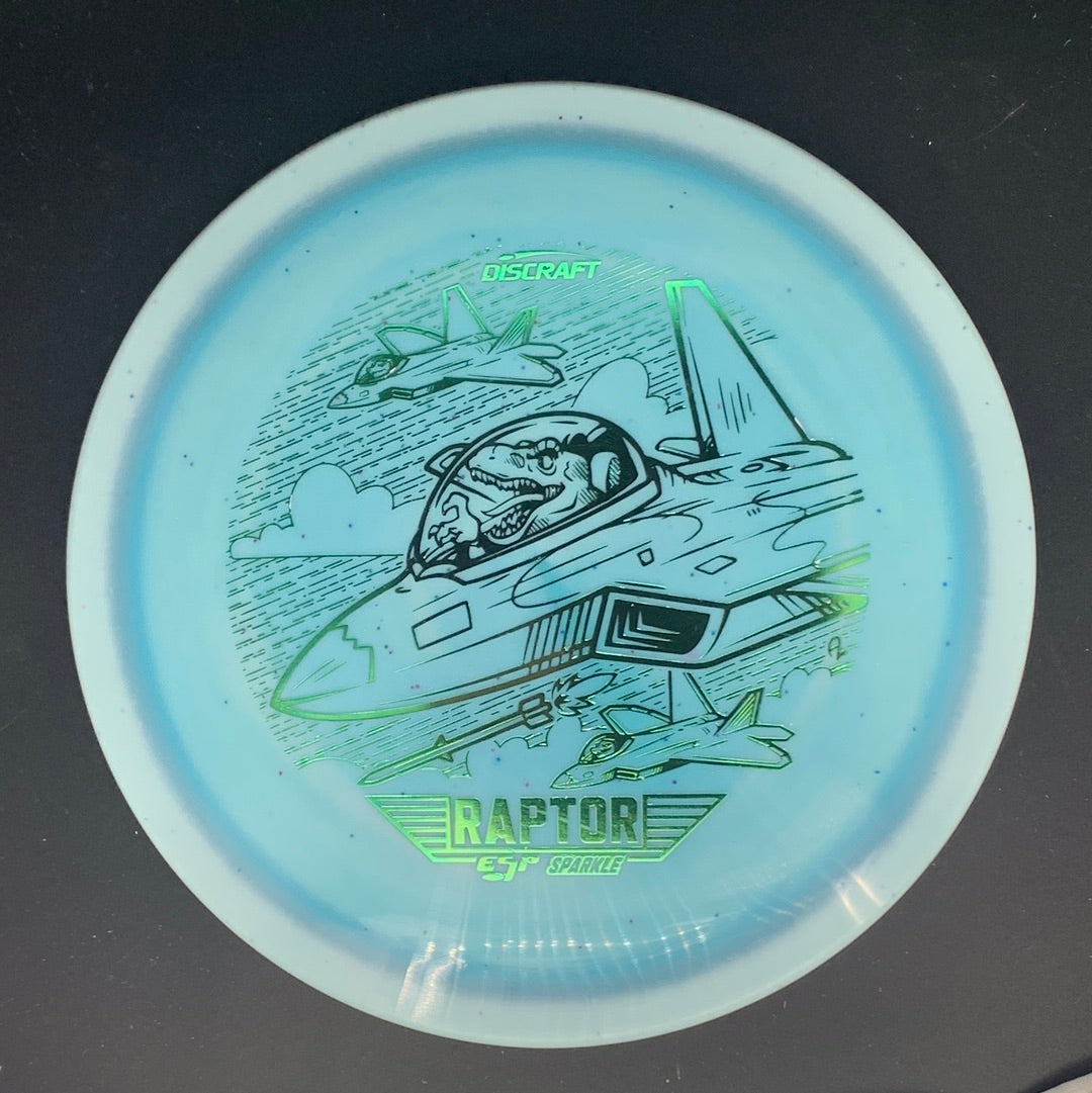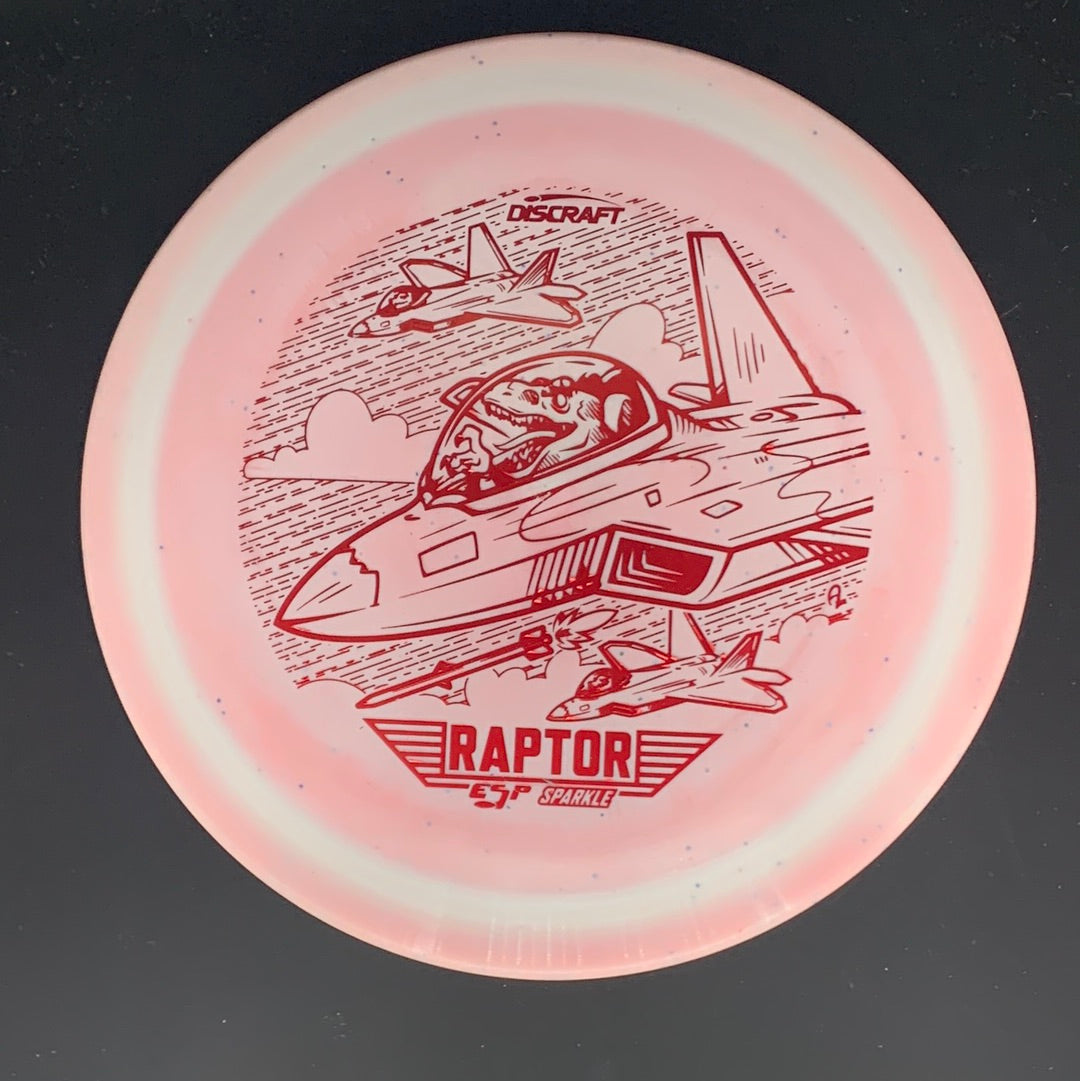 The Raptor is an overstable fairway driver capable of fighting strong winds. It has a flat flight plate and comfortable rim depth for both forehand and backhand grips. The ESP plastic in this run is tacky with a bit of flex for an amazing feel in the hand. The coloration in these Raptors produces a halo-like border around the rim. This particular run is much lighter than a standard produced run of Raptors, with weights ranging in the mid-to-low 160s. However, this run still maintains the trusted overstability of a stereotypical Raptor. The stamp features raptor dinosaurs flying fighter jets on an attack mission.