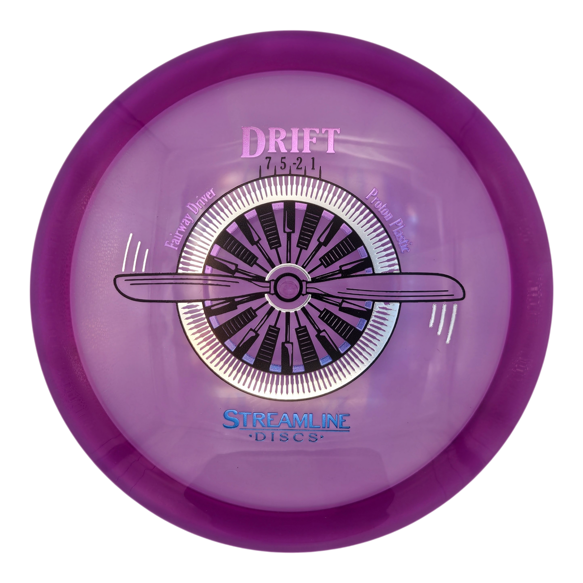 The Drift is designed for laser straight lines ending with a gentle fade and an exceptional amount of glide, providing easy distance with this highly versatile driver. The Drift has a modest rim size, a slightly domed profile, and an easily activated turn for hyzer-flips or big turnover shots. The Drift will make its grand debut in Neutron Plastic, pairing perfectly with its bright opaque colors, durability, and grip. This Speed 7 driver is the first fairway driver in the Streamline fleet and continues the trend of stunning triple-foil stock stamps.