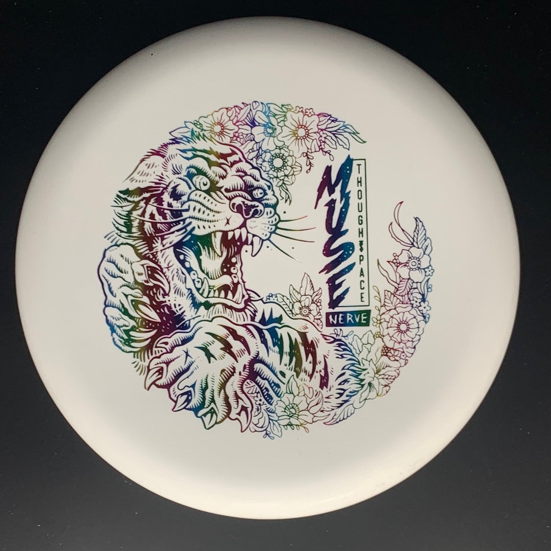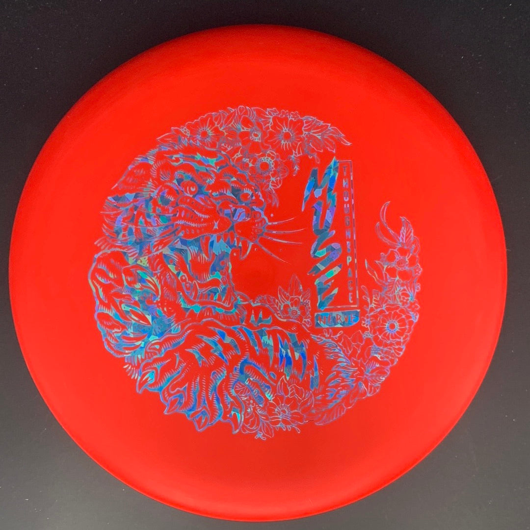 Well executed putts are a thing of beauty, gracefully flying through the air while connecting the metal target with a loud CHING. But, in competition, they are also a means to instill aggression and dominance as you fight and claw your way to victory. The "Floral Tiger" design shows both sides of this putting dynamic. An enchanting wave of floral beauty hides the prowling tiger attacking the chains.