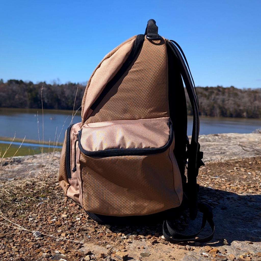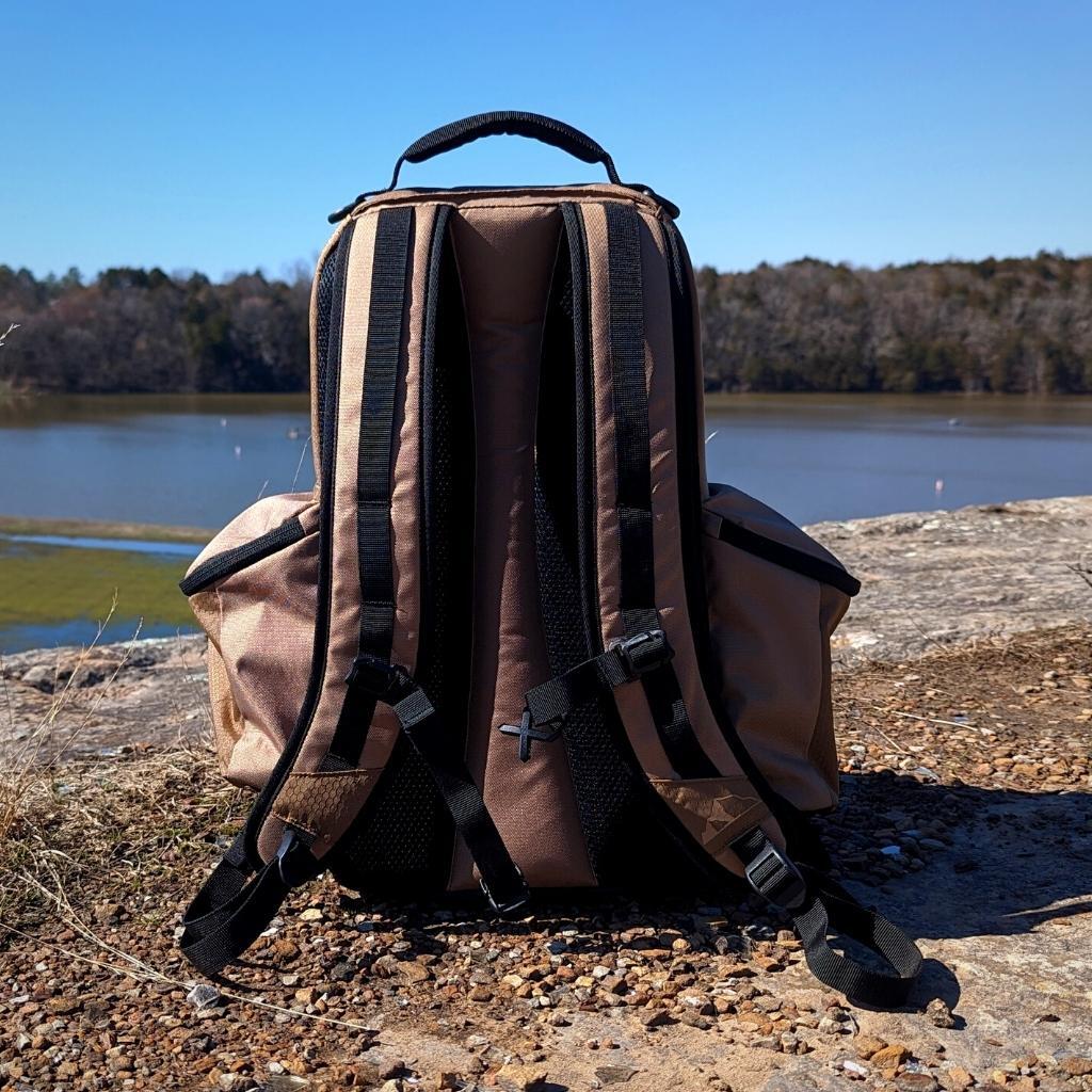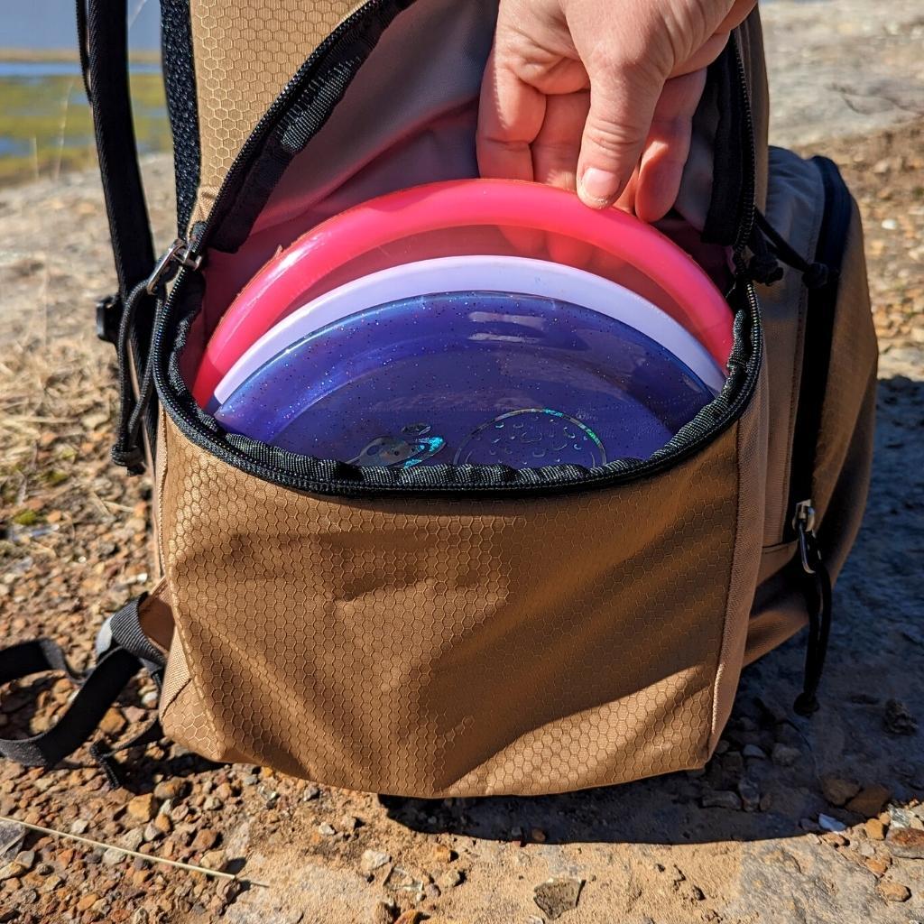 The large zippered side pockets give you extra storage for all your essentials, while the larger front pocket makes it easy to grab anything you need. The added feet make it stable on any surface, while the improved carrying handle and shoulder straps make it comfortable to carry. Plus, the rear air channel keeps you cool on hot days, and the waterproof material on the bottom keeps your discs dry in wet weather.