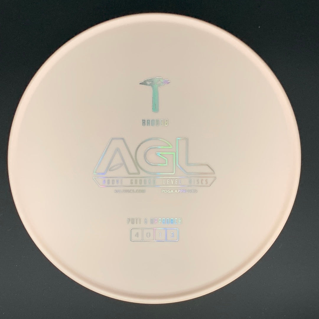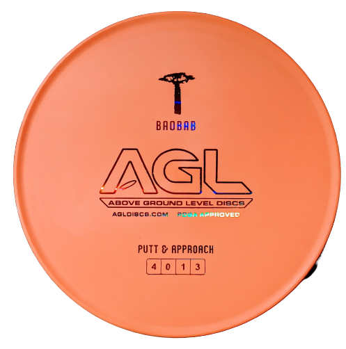 The AGL Discs Baobab is an extremely overstable putt and approach disc golf disc. The Baobab sports a unique set of flight numbers at 4/0/1/3. This disc does not like to fly and when it does, it likes to fade hard. NO ONE TERM can quite define the Baobab but it has quickly become a favorite among those who have thrown it. The Baobab features a top bead and flat top making it comfortable to throw both backhand and forehand further increasing its versatility. When made in our premium Alpine plastic, this disc becomes a freight train of a forehand roller shot, hence earning the title the “Bao-Bowler”! Whether you need a long putt to fall quickly to avoid trouble, need a tight s-curve flight, or just need a disc to dump hard the Baobab will take your approach game Above Ground Level.